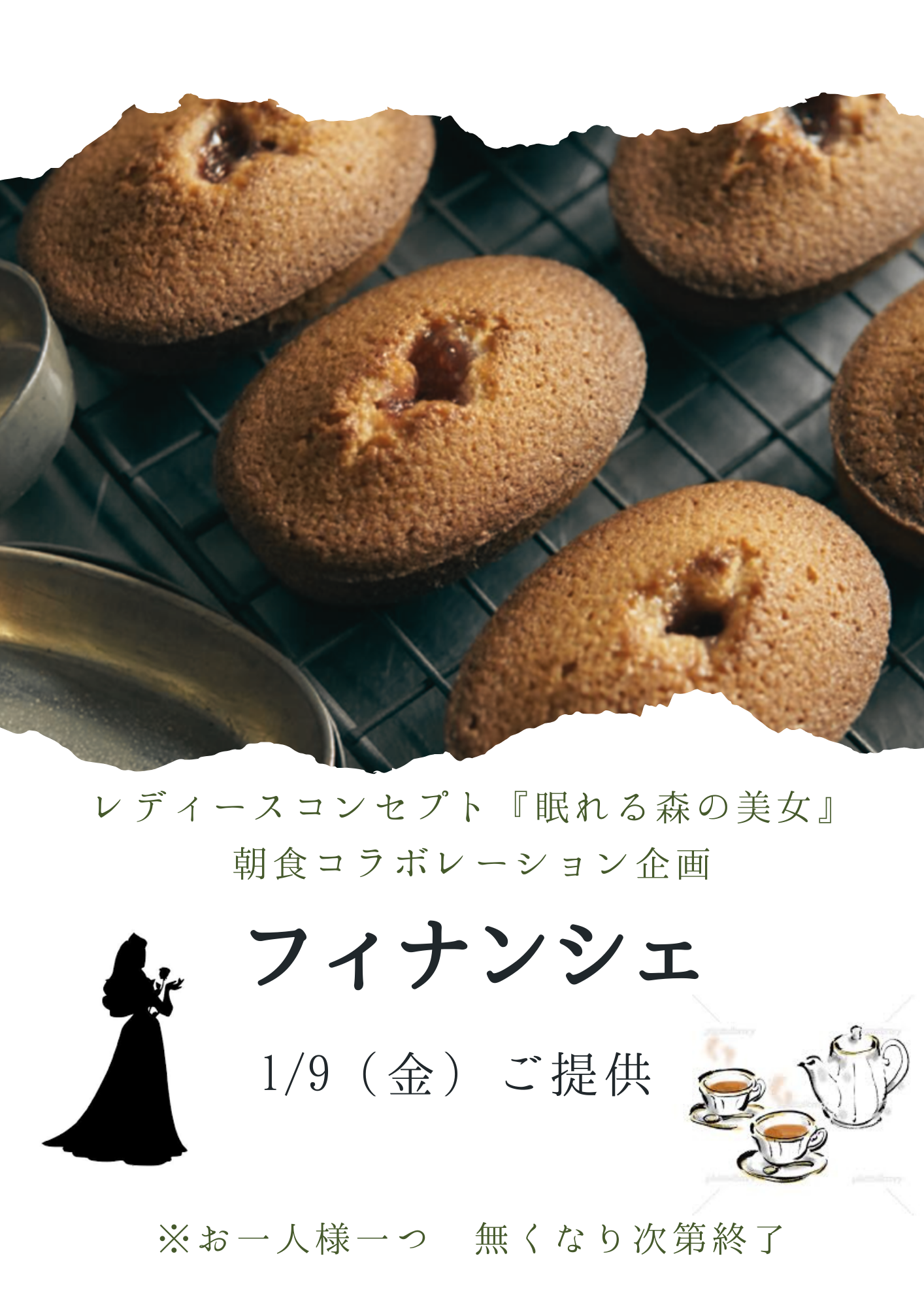 - コンセプト眠れる森の美女コラボSPメニューとして、地元『花と紅茶専門店 JUL et SWAN(ユール エ スワン)』様の洋菓子をご提供いたします(SDGs)。1月はフィナンシェ。