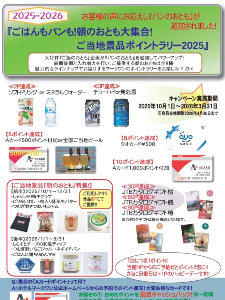 - 当館ホームページ予約のご宿泊は、通常1泊1ポイントのところ2ポイント付与されてお得。「ポイントラリープラン」をお選びいただくと、更に+1ポイントで得々。ご検討下さい。