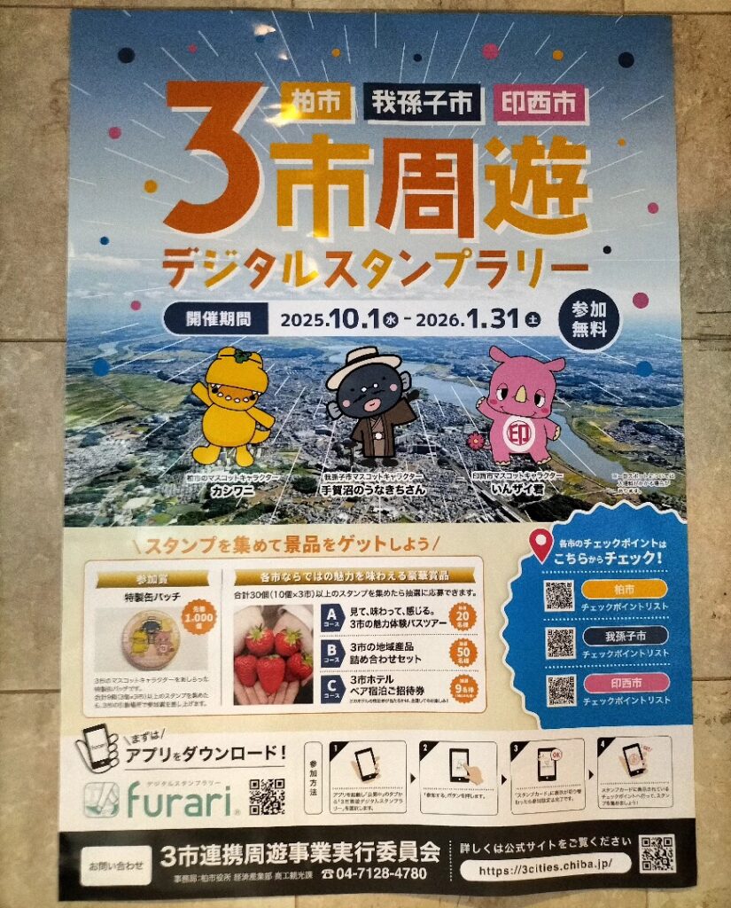 - 柏市・印西市・我孫子市の3市で開催中のスタンプラリーです。当館も我孫子市のチェックポイントです。