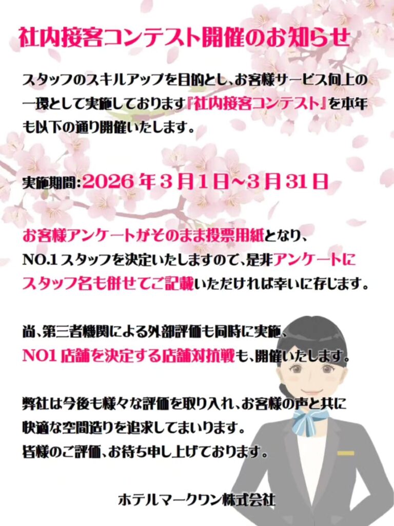 客室アンケートがそのまま投票用紙になりNO.1スタッフを決定致しますので是非アンケートにスタッフ名も併せてご記載頂ければ幸いに存じます。