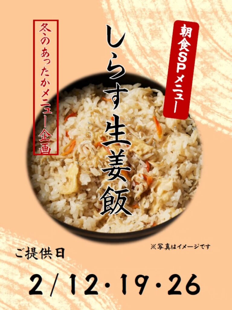 ご好評いただいております『朝食スペシャルメニュー』。今月は『冬のあったかメニュー企画』ということで『しらす生姜飯』をご提供いたします。