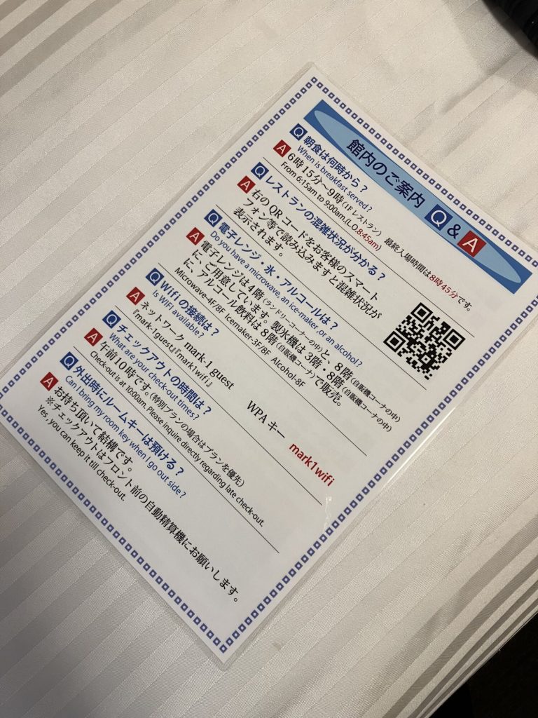 ⇒ご指摘いただきまして、誠にありがとうございます。ご不便をお掛けしてしまい、申し訳ございませんでした。直ぐに客室Q&Aを作成し直し、全室にて差し替えが完了いたしました。今後もより良いホテルづくりに努めて参りますm(__)m