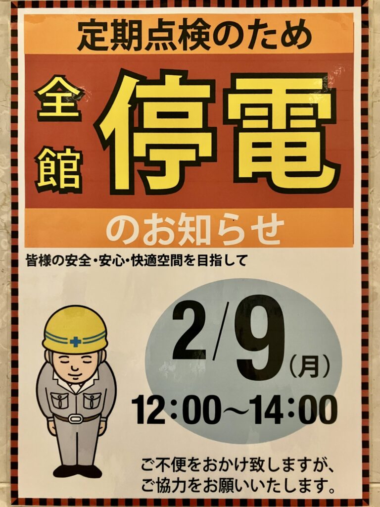 定期点検のため、下記日時にて全館停電となります。お客様にはご不便をおかけ致しますが、何卒ご理解・ご協力の程よろしくお願い申し上げます。 記 日程:2月9日(月) 時間:12:00~14:00予定