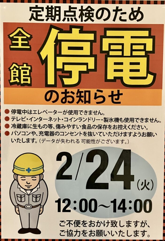 【全館停電のお知らせ】2月24日(火)12:00~14:00定期点検のため、全館停電を実施いたします。上記時間帯につきましては、館内の電気設備がご利用いただけません。お客様にはご不便をおかけいたしますが、安全確保のための点検となりますので、何卒ご理解・ご協力のほど宜しくお願い申し上げます。