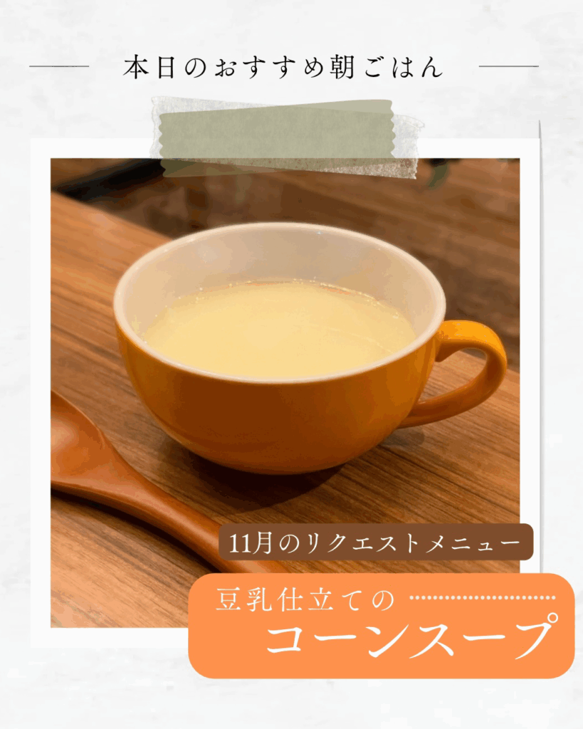 11月レストランのリクエストメニューは『豆乳仕立てのコーンスープ』です♪