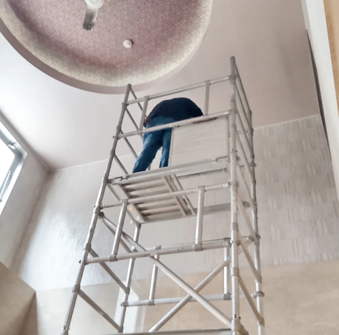 併せてロビー高天井のシーリングファンの清掃も致しました。